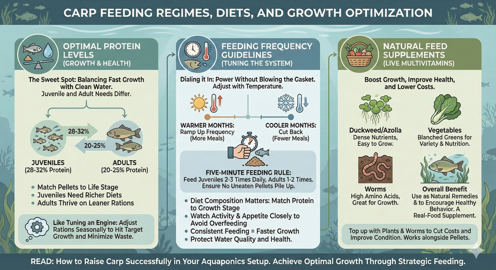 In my experience, juvenile carp need richer diets while adults do fine on leaner rations — it’s simple, really. I use three rules of thumb: